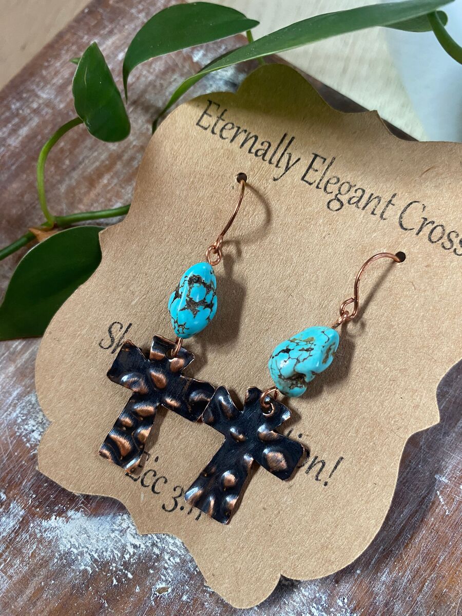Each piece features striking magnesite beads, symbolizing purity and cleansing, paired with intricately crafted copper crosses that reflect the eternal significance of salvation. Whether you're wearing them for a special occasion or as part of your daily attire, these earrings offer a unique way to share your salvation story with the world—a conversation starter that connects you to others.