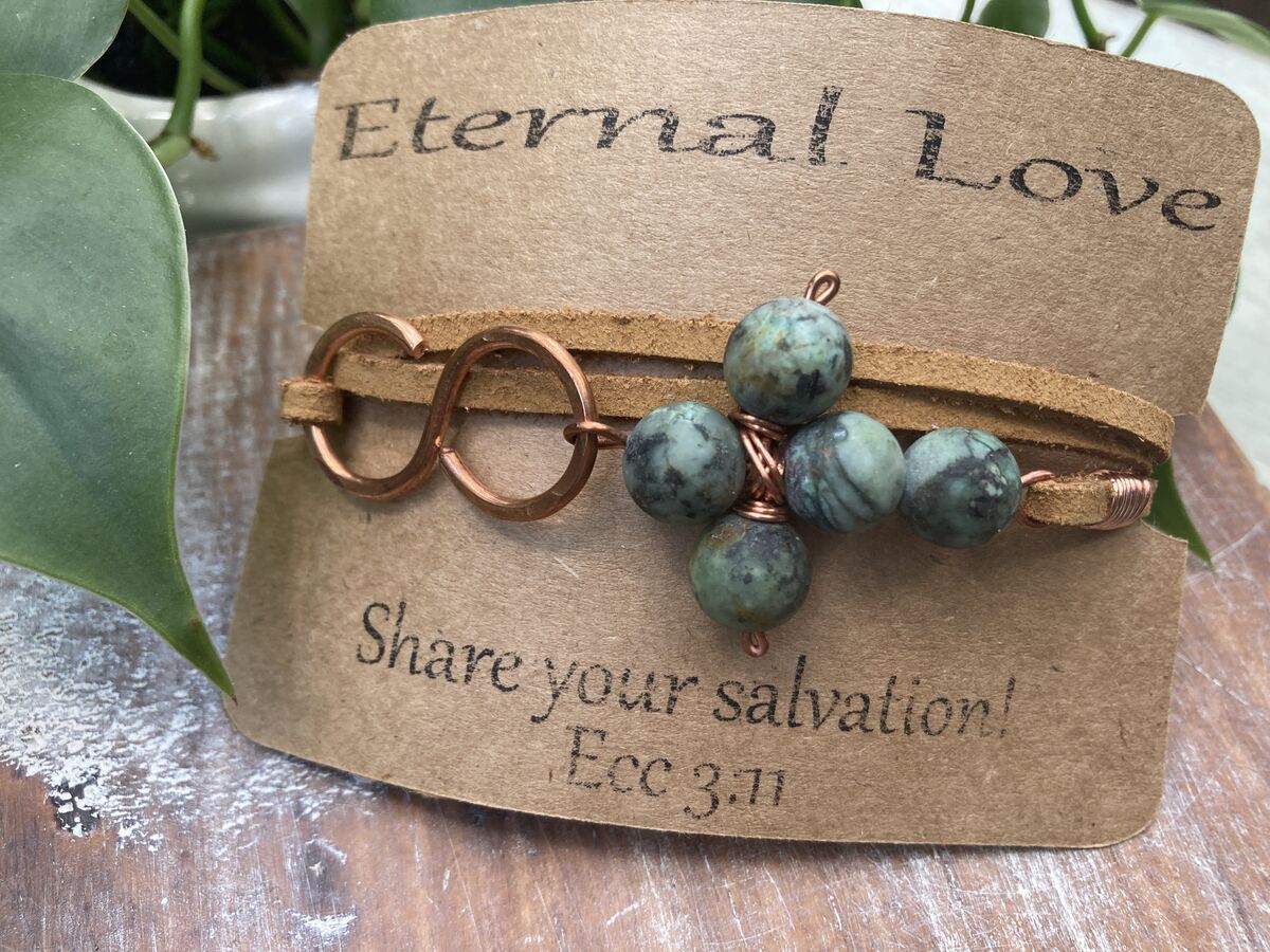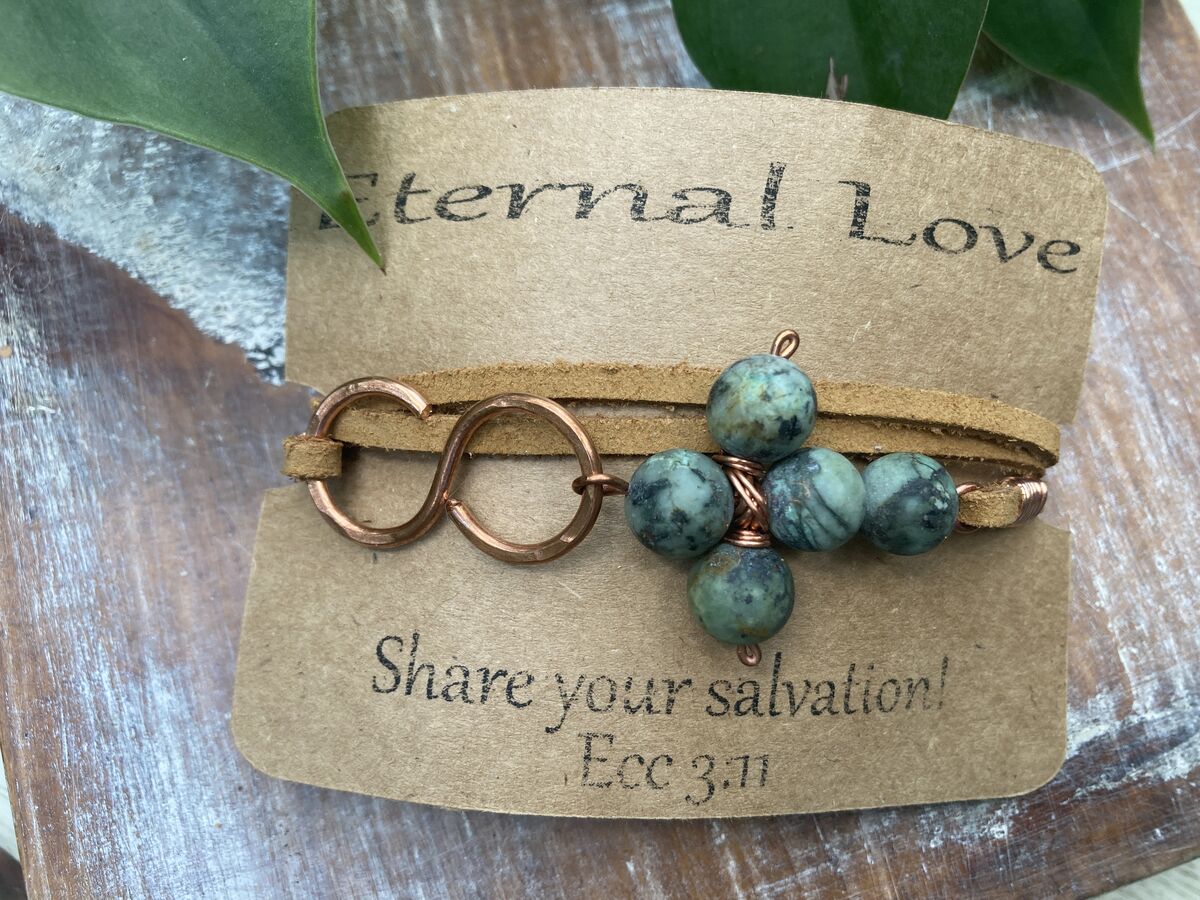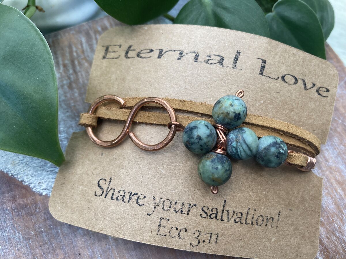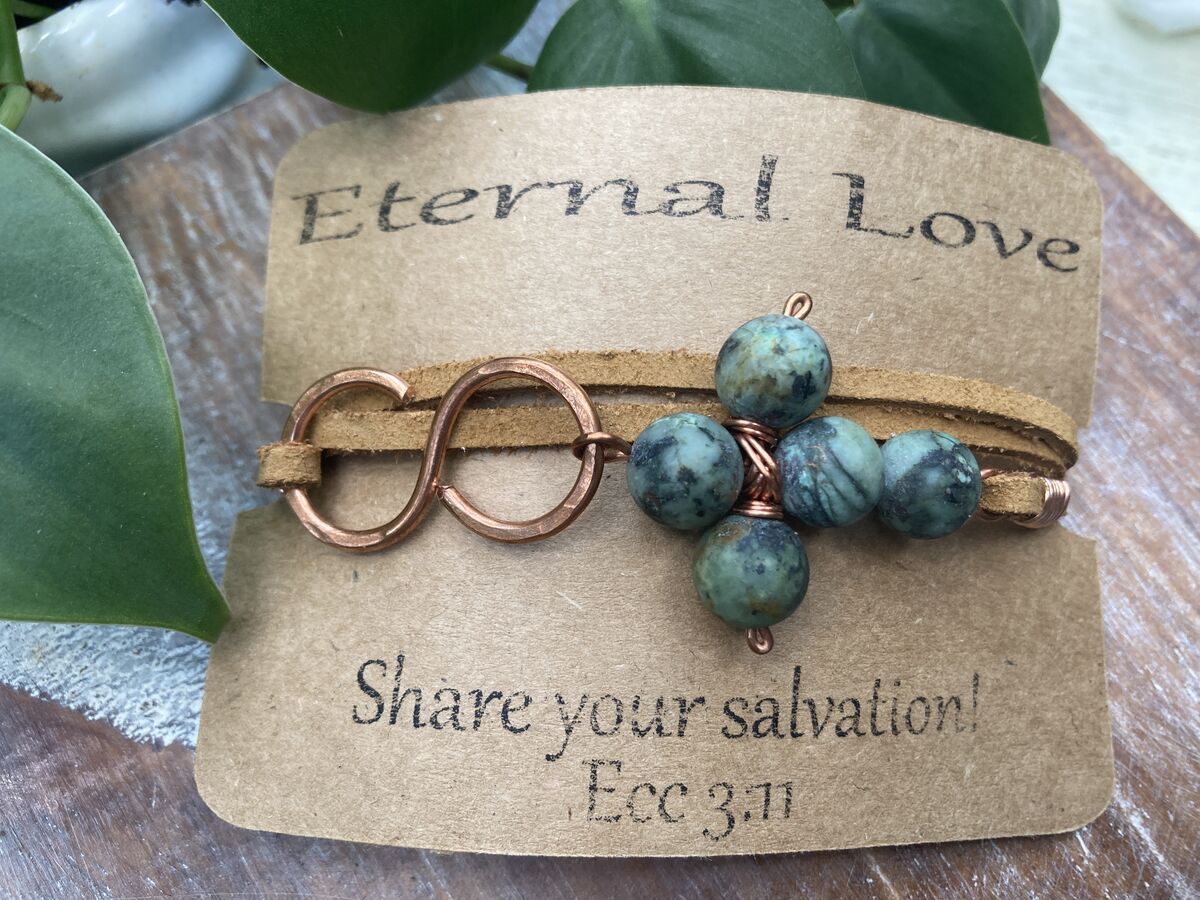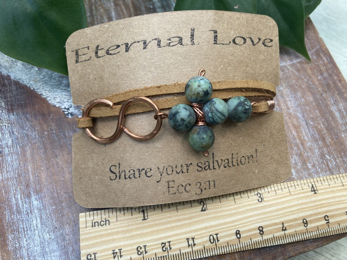 Embrace the beautiful fusion of faith and elegance with our African Turquoise Cross Leather Wrap Bracelet. This stunning piece intricately weaves together vibrant African turquoise stones. The central cross pendant serves as a powerful reminder of spiritual salvation, guiding you through life’s journey with grace and purpose.