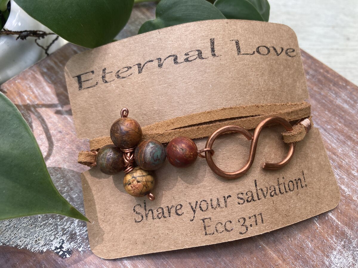 Introducing the Picasso Jasper Cross Leather Wrap Bracelet, a stunning fusion of faith and fashion that embodies the essence of spiritual salvation. Each unique piece of Picasso Jasper stone is a testament to the infinite beauty found in nature, capturing the eye with its rich, earthy tones and intricate patterns.