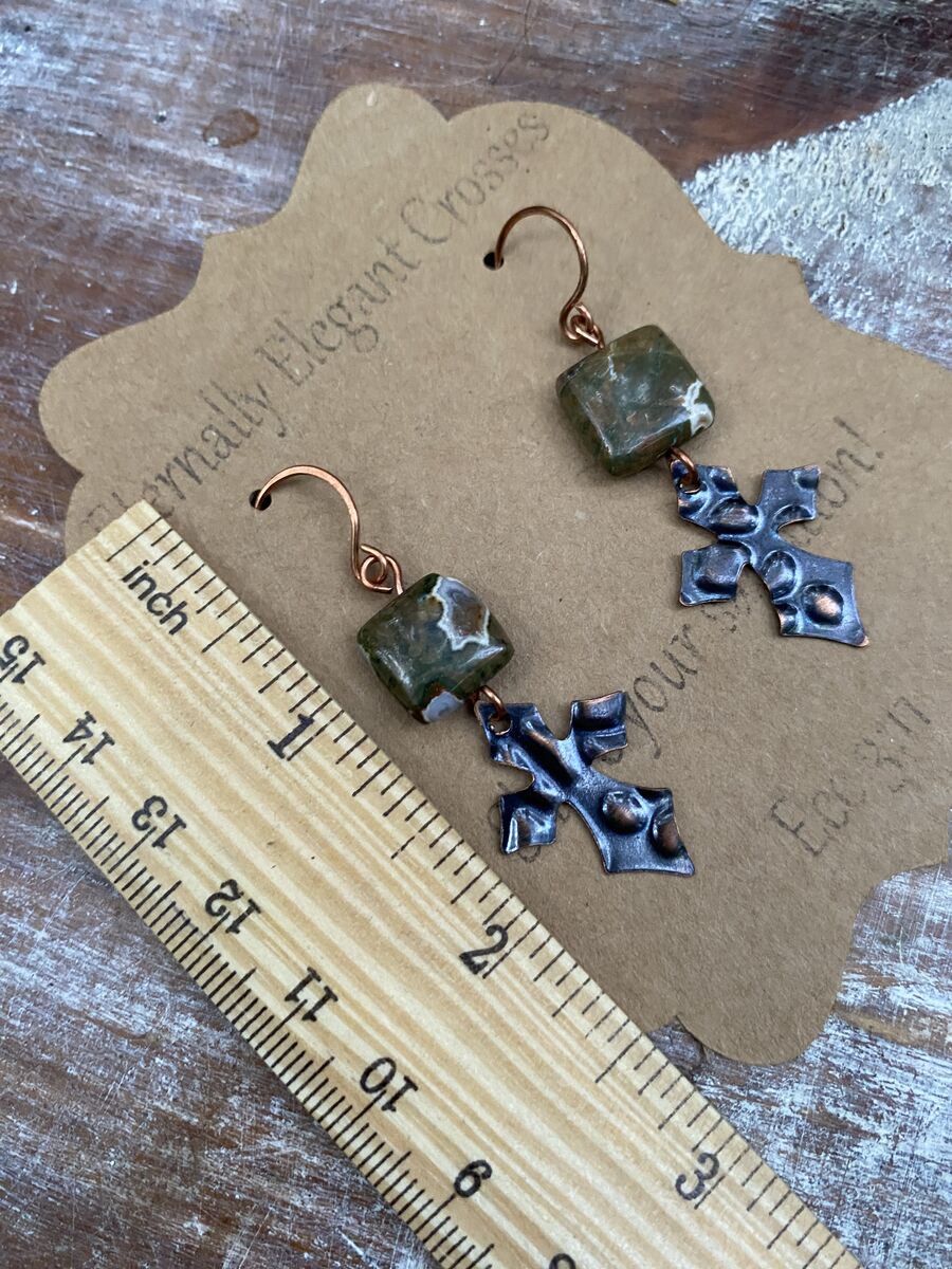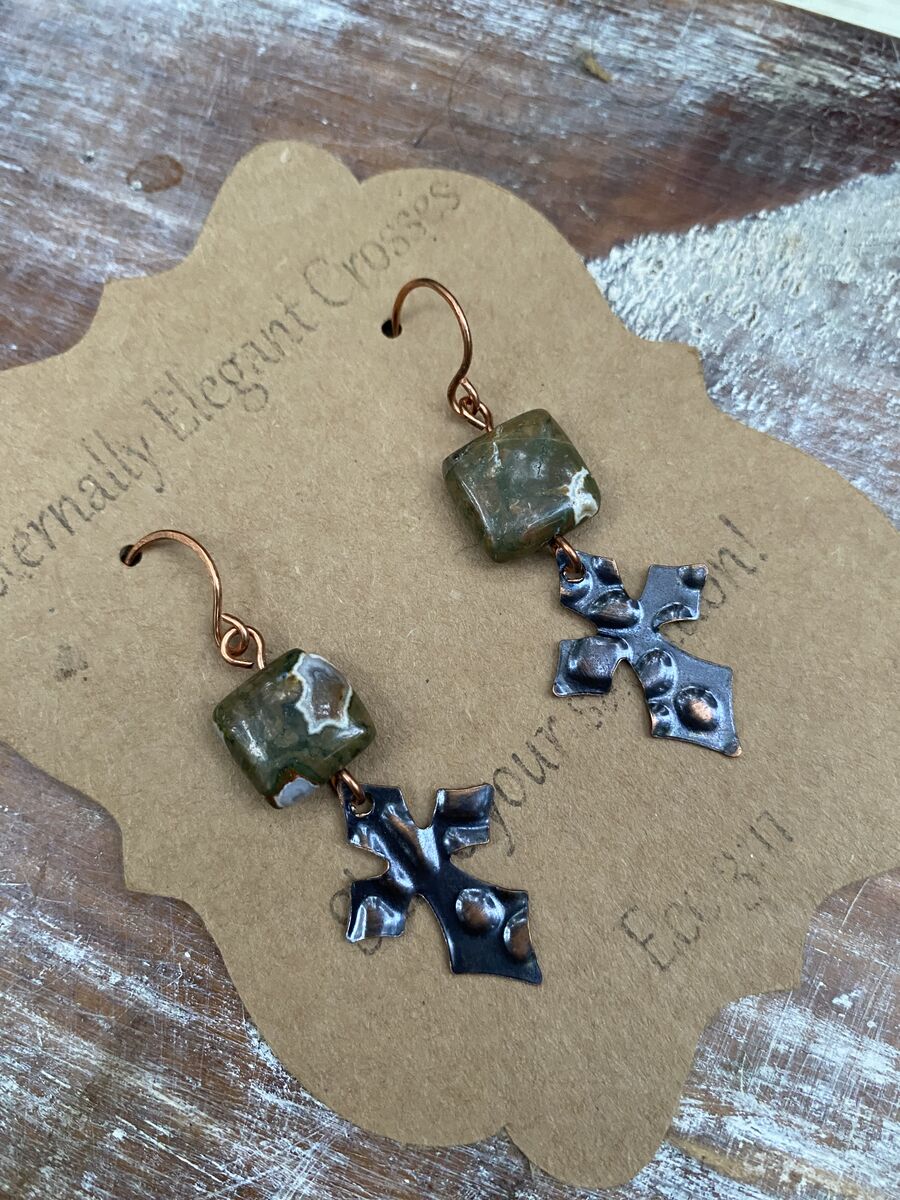 Distressed Agate Copper Cross Earrings | Religious Jewelry