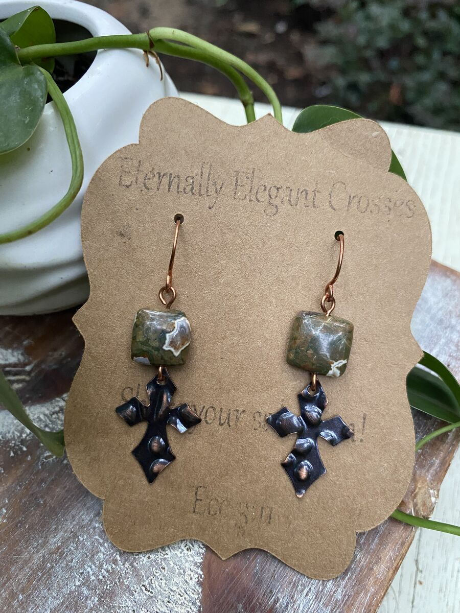 Our exquisite Forest Jasper Copper Cross Earrings are a beautiful blend of natural elegance and faith-inspired design. Each piece features stunning forest jasper stones, characterized by their rich earthy tones and unique patterns, symbolizing the beauty of creation and the grounding essence of nature.