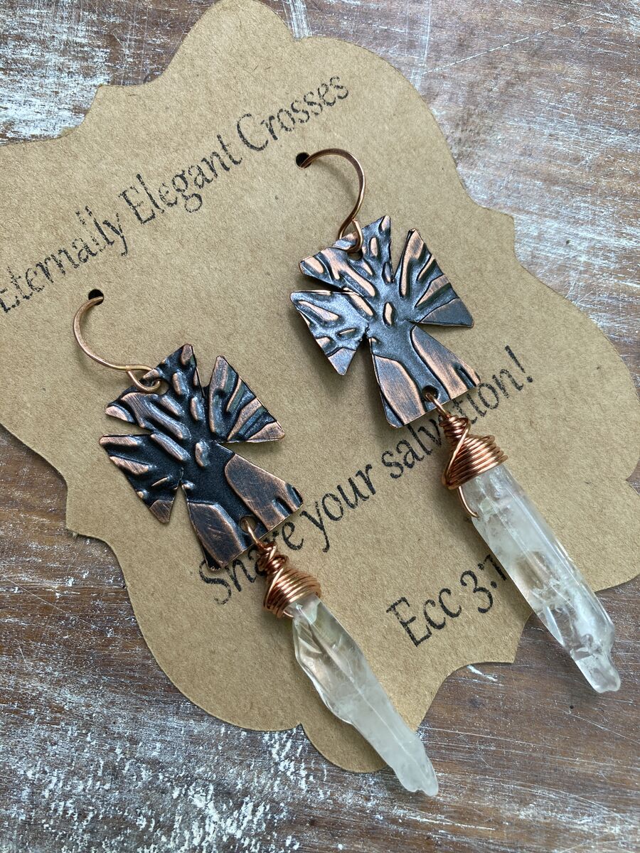 Handcut Copper Cross Tree of Life Quartz Point Earrings