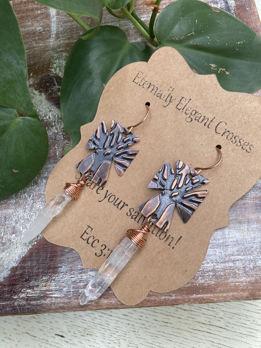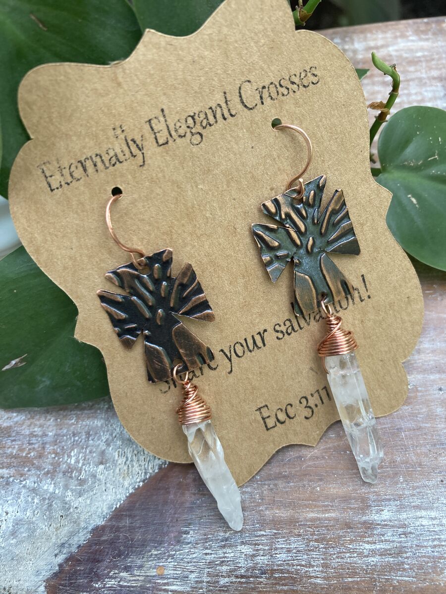 Each earring features a meticulously handcut copper cross, symbolizing the profound connection between the divine and life itself. The enchanting tree of life design encapsulates the essence of growth and renewal, while the stunning quartz points serve as a reminder of the strength found in faith.