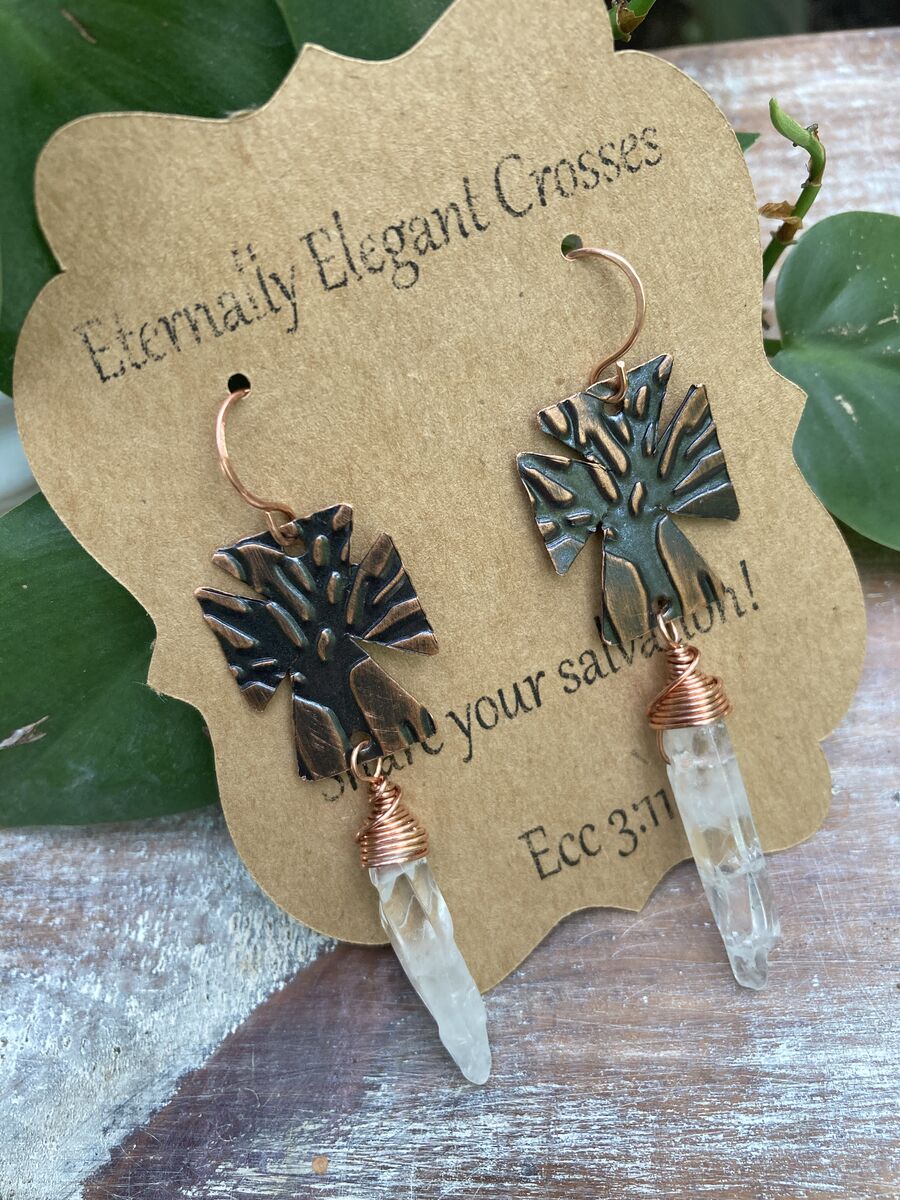 Introducing our exquisite Handcut Copper Cross Tree of Life Quartz Point Earrings, where artistry meets faith in a beautifully crafted piece that tells a story of salvation and hope. These earrings are not just an accessory; they are a testament to one's journey of faith, made for those who wish to share their personal testimony through fashion.