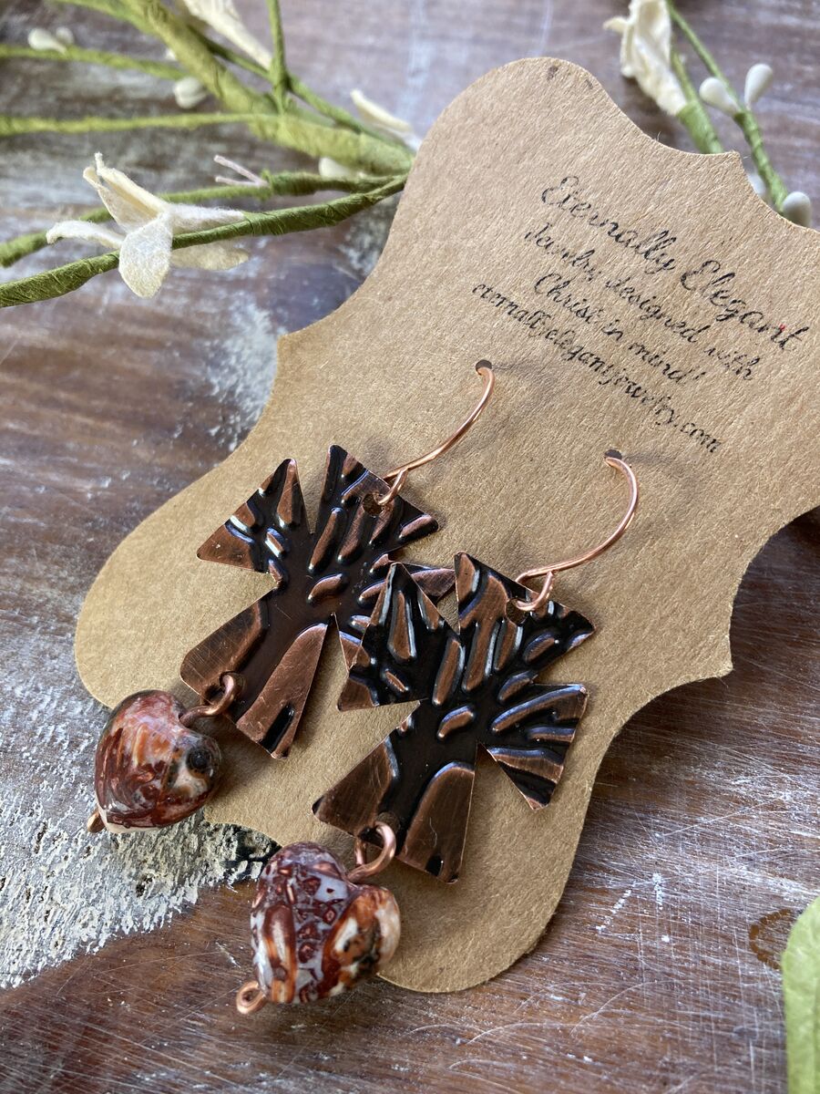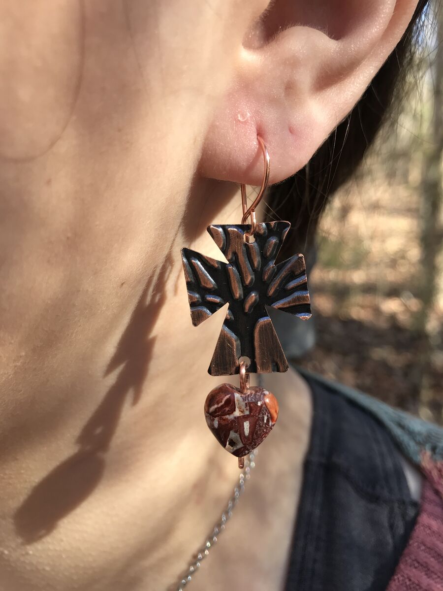 These stunning copper crosses have been embossed with the tree of life and patinaed for depth. I then hung agate hearts from them to finish them off. Make a bold statement and stand out with these beauties!