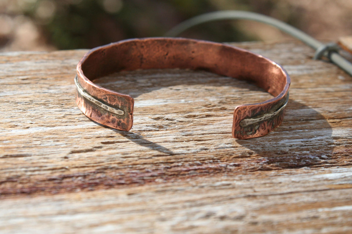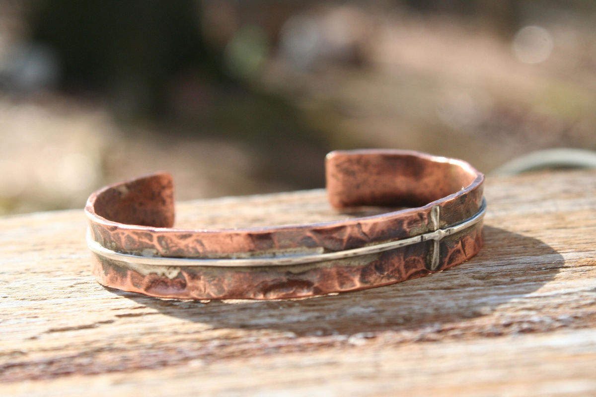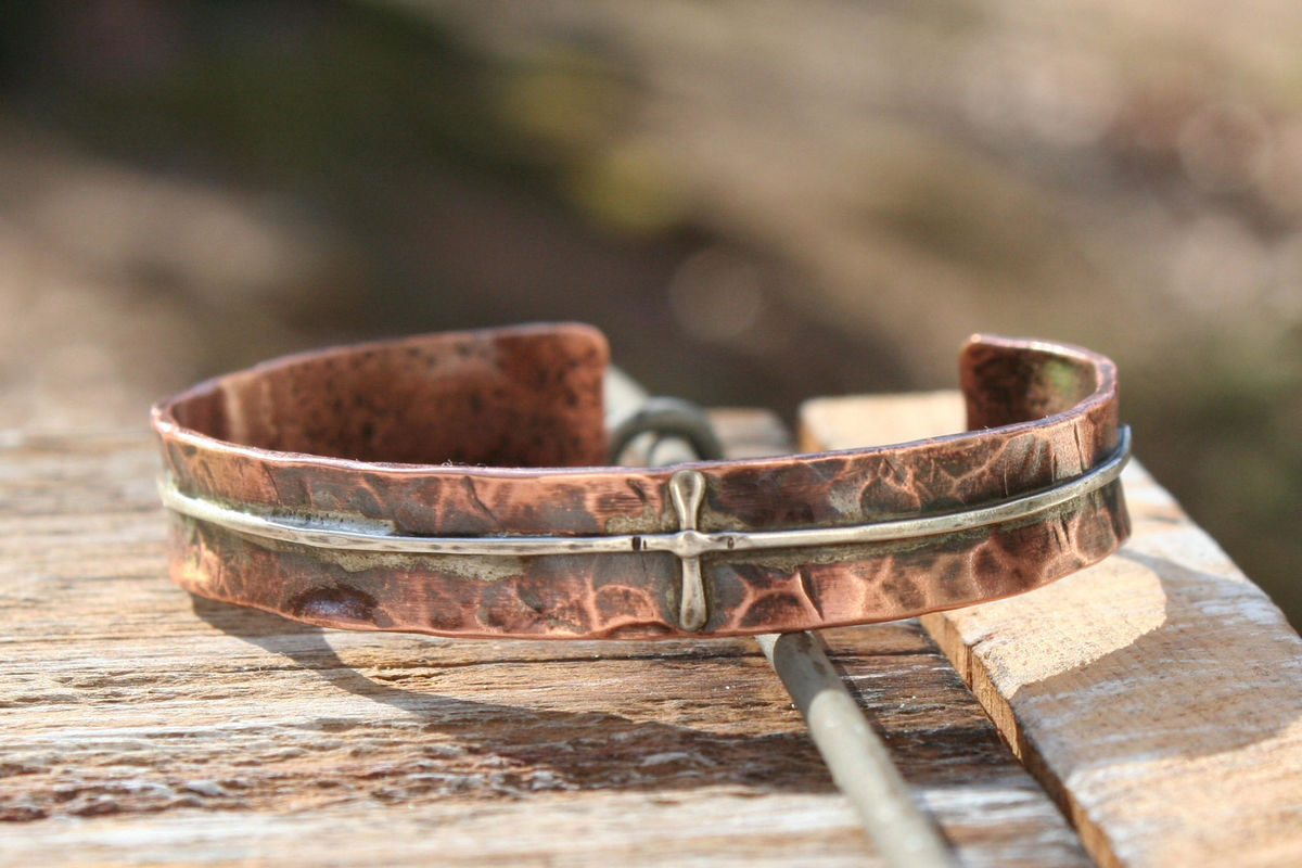 This hand-formed bangle bracelet is made of copper with a nickel overlay cross. Please note that there may be a slight variation due to the hammering process.