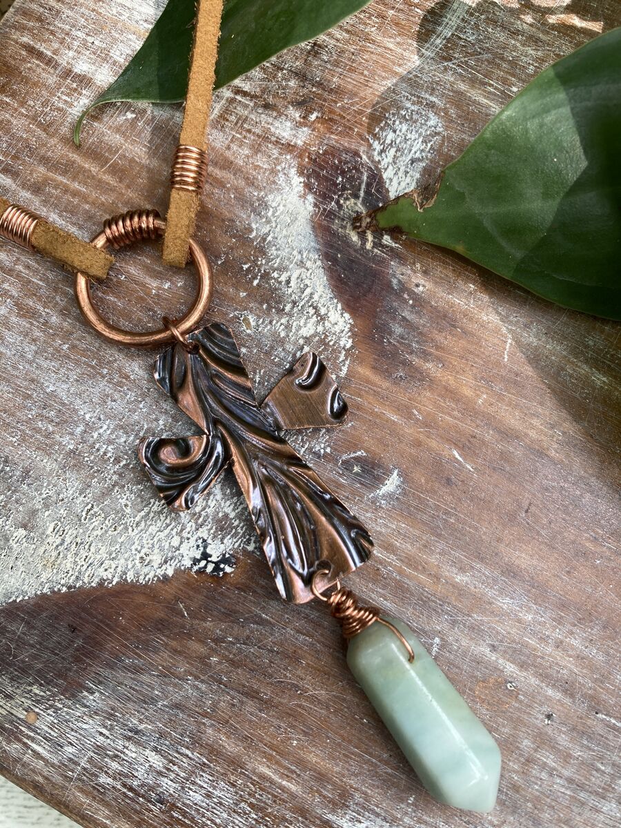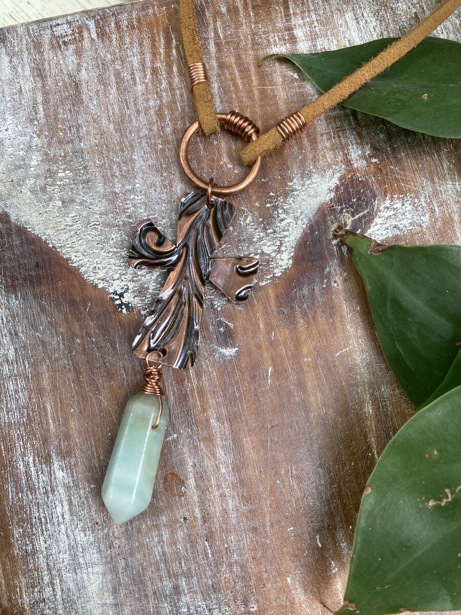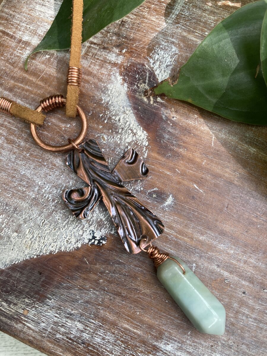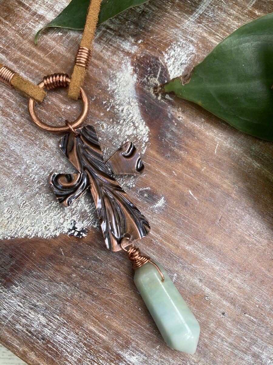 Amazonite Point Hand-cut Embossed Copper Cross Leather Necklace | 22in listed in: