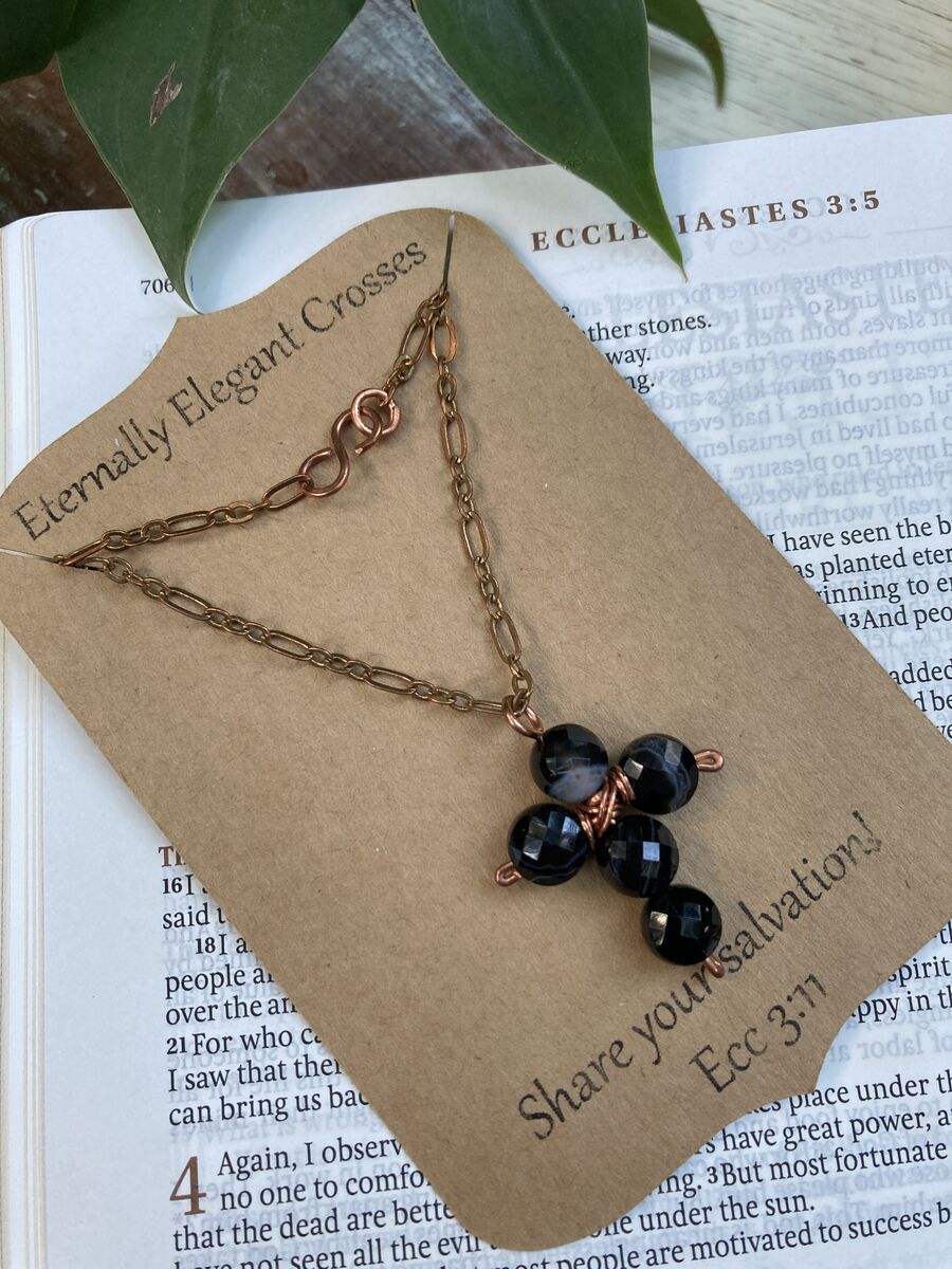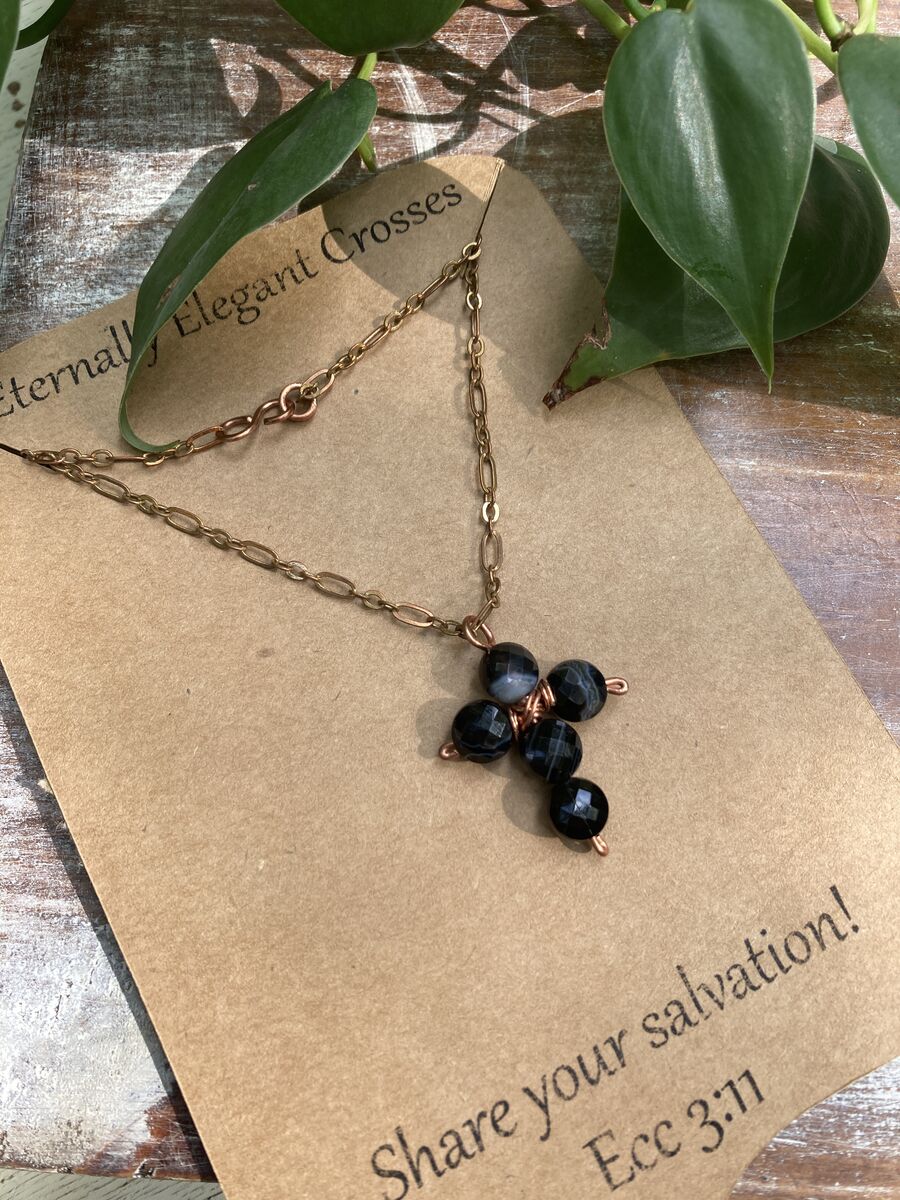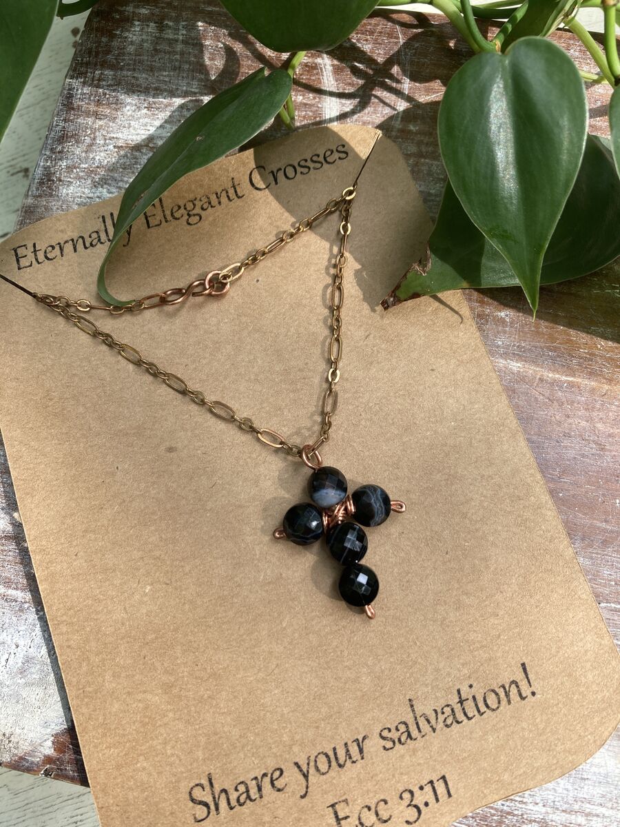Introducing the Black Agate Cross Copper Necklace, a stunning piece designed to be more than just an accessory—it's a powerful reminder of your faith and a beautiful way to share your salvation story with the world.