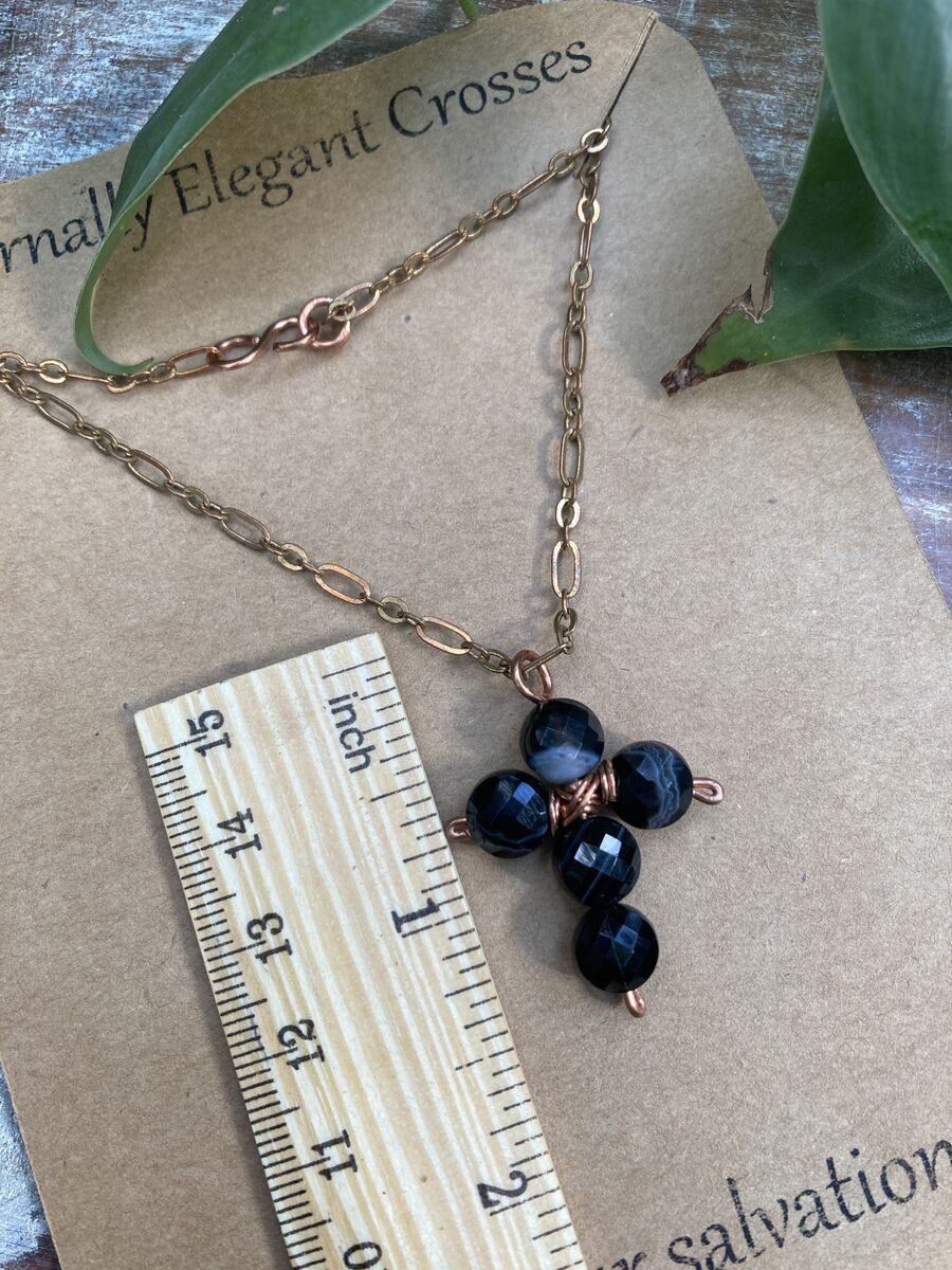 Crafted with care, this 18-inch necklace features a striking black agate cross that symbolizes strength and protection. The deep black hue of the agate reflects a sense of depth and mystery, while the warm copper accents bring a touch of elegance and warmth. Each glance at this necklace serves as a reflection of your beliefs, encouraging conversations about love, hope, and redemption.