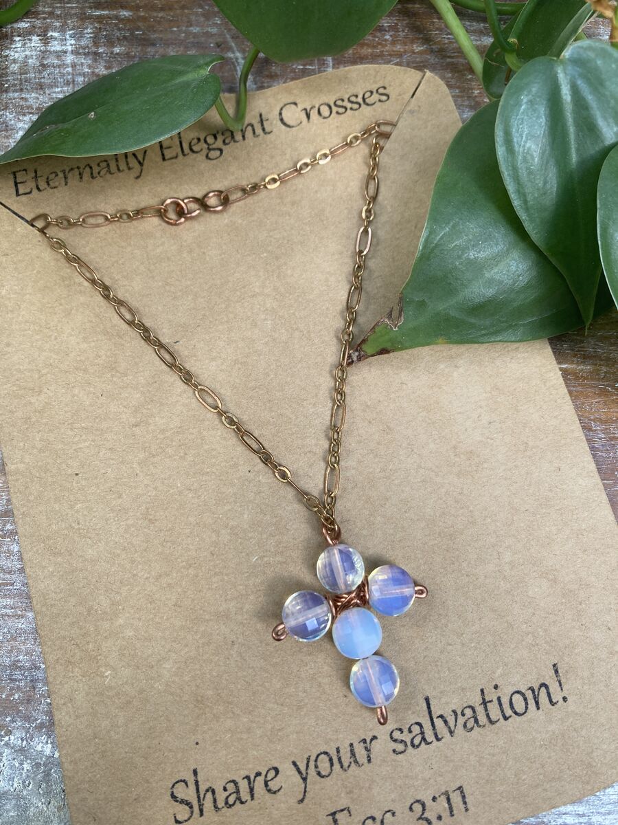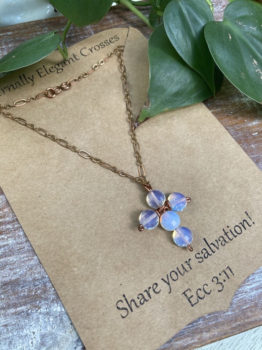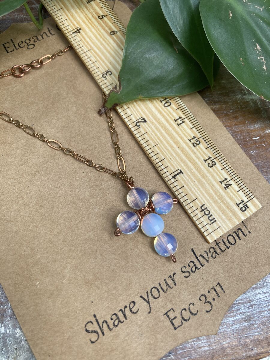 Suspended from a delicately designed copper chain, this necklace not only serves as a reminder of your beliefs but also enhances any outfit with its timeless charm. Each opal gemstone signifies hope, purity, and a deep connection to the divine, making this piece a perfect gift for yourself or a loved one seeking inspiration and strength.